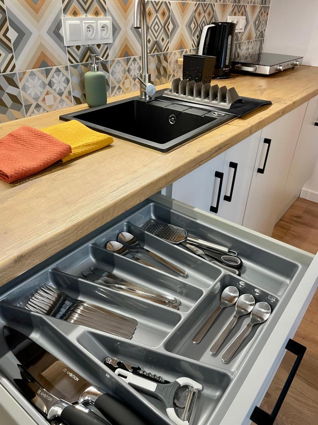 Oferta apartamentu obejmuje sypialnię (1), salon, kuchnię z pełnym wyposażeniem, w tym lodówką i czajnikiem, a także łazienkę (1) z prysznicem oraz suszarką do włosów. W apartamencie zapewniono ręczniki i pościel.
